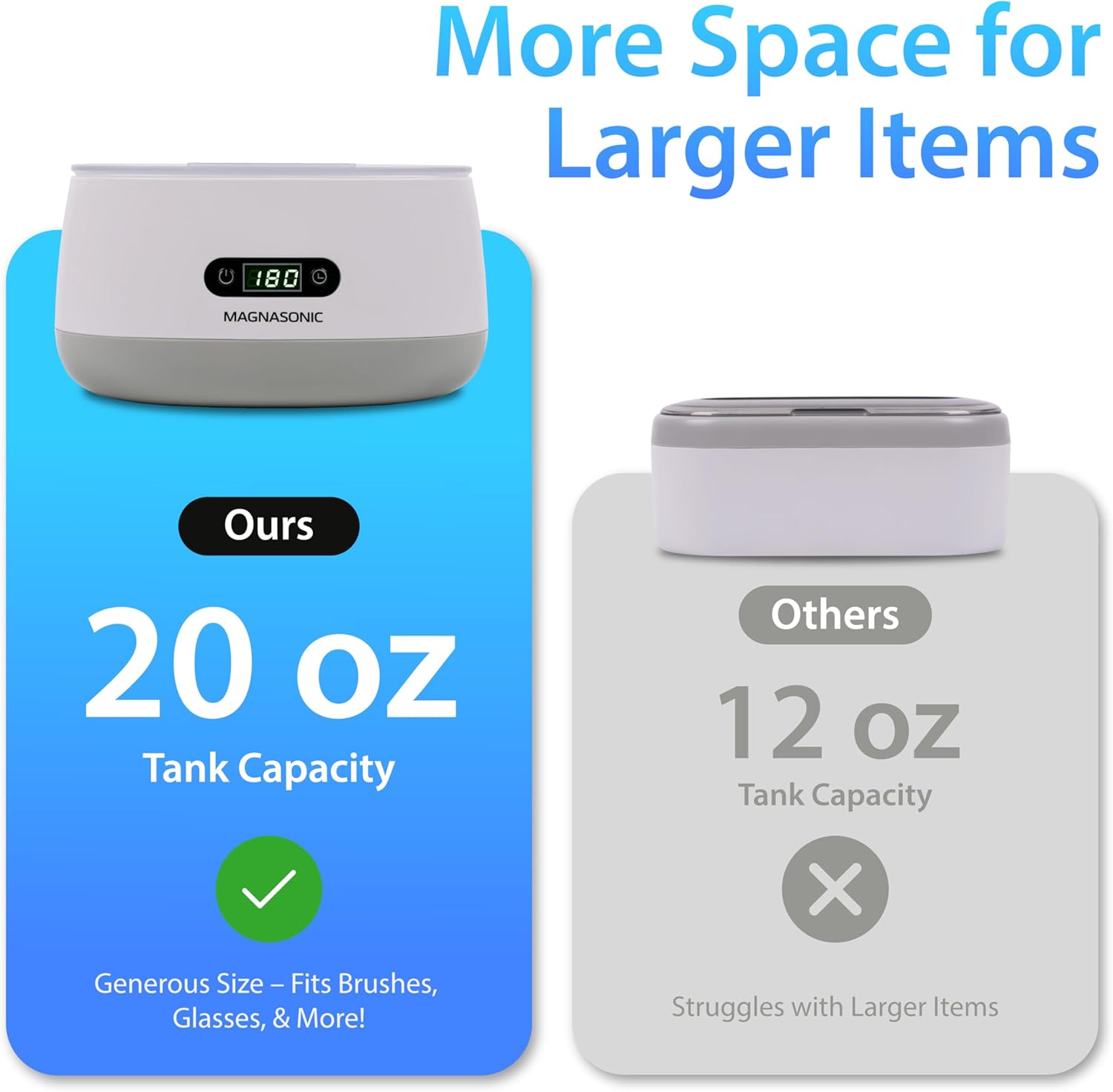 MORE CYCLES, MORE SPACE, BETTER CLEANING: With 5 modes and a 20oz tank, larger than most models, this ultrasonic jewelry cleaner simplifies daily maintenace of your accessories and dental appliances