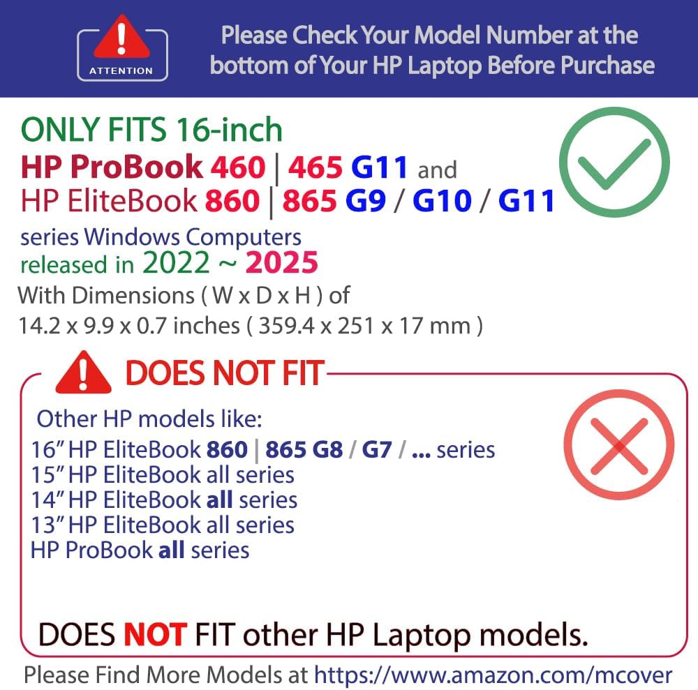 Designed to perfectly fit the 2022~2025 16" HP ProBook 460 | 465 G11 series and HP EliteBook 860 | 865 G9 / G10 / G11 series Windows Notebook PC with dimension (Width x Depth x Height) of 14.2 x 9.9 x 0.7 inches ( 359.4 x 251 x 17 mm )